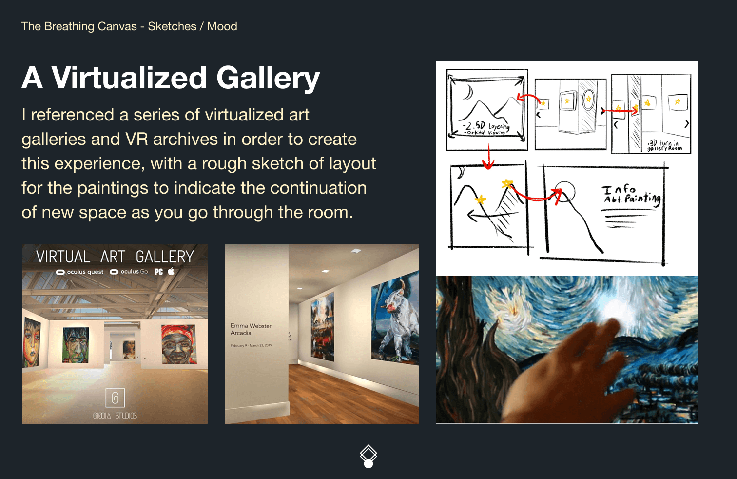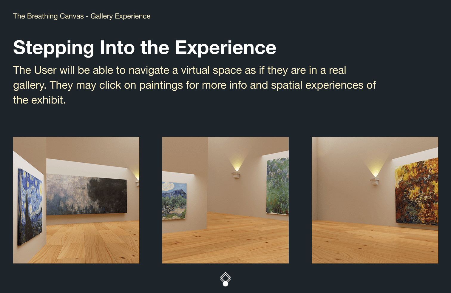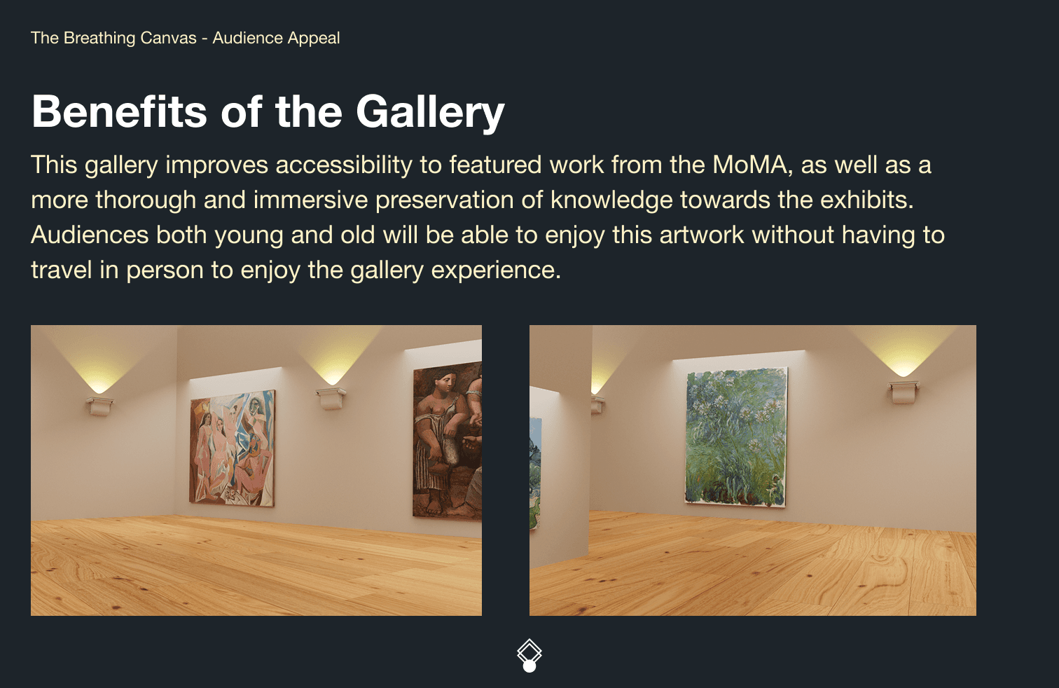 Art exhibits (specifically, the ground-breaking exhibits of the MoMA) are historical and national treasures. This project aims to support accessibility to those treasures from any location, while immersing the audience through an interactive simulation that will enhance the simple viewing experience from their own screens.